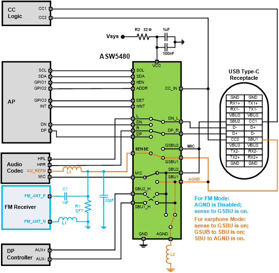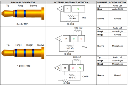 耳机接口类型:当终端设备外接Type-C转3.5mm耳机应用时,因为耳机的插头有三种模式:OMTP、CTIA、三段式。每种模式对应的管脚定义如下所示,这种场景下就需要在耳机插入后,处理器通过ASW5480来识别哪种模式,然后发送对应的寄存器切换开关的通道。
