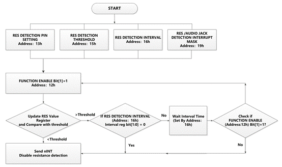 3. 配置寄存器0x12的bit[0]=1 (耳机插入检测配置的使能开启,检测配置后会自动复位置“0”);