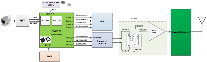 GM5528是一个两级锁相环,集成了一个JESD204B SYSREF发生器,用于多设备同步。GM5528可产生14路输出,最高频率为1.25GHz。每个输出都可以配置为直接从PLL1、PLL2和内部SYSREF生成器输出。
