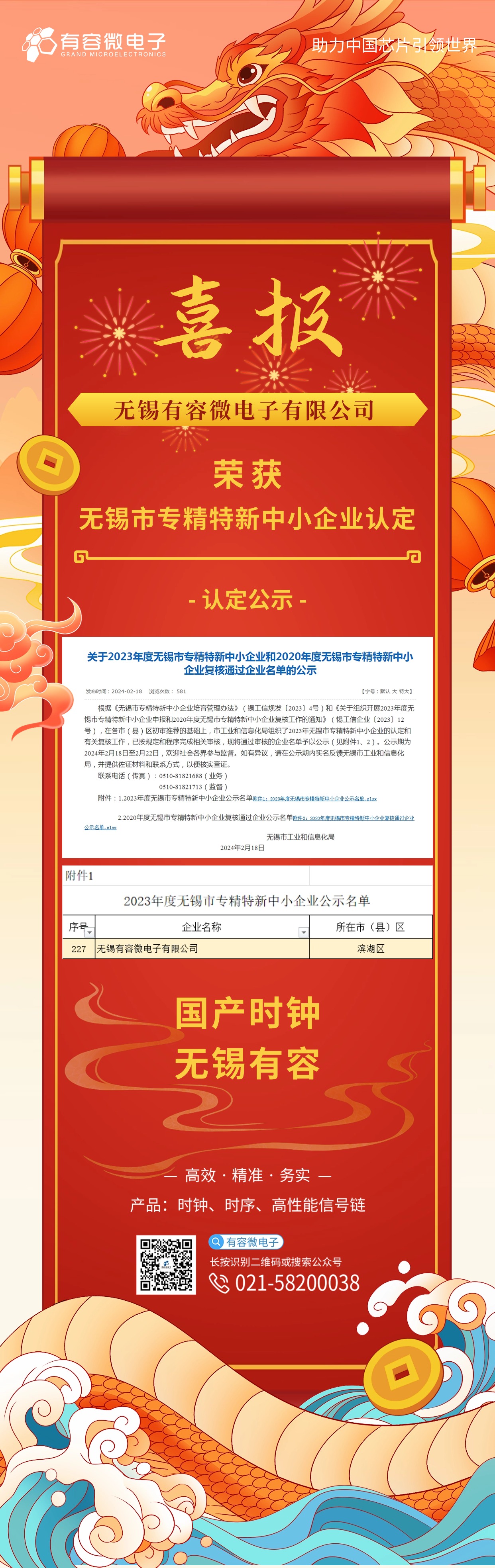 近日,无锡市工业和信息化局发布公告,无锡有容微电子荣获无锡市专精特新中小企业认定。